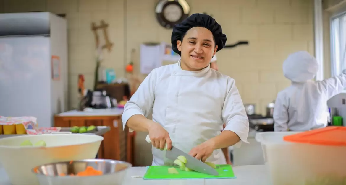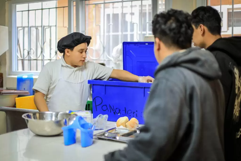 “Actualmente me desempeño como auxiliar de cocina. Ayudo a preparar los alimentos de cada día, como el desayuno, el almuerzo y las refacciones para los adolescentes. También apoyamos a los jóvenes que están en formación en el taller de cocina, compartiendo con ellos lo que hemos aprendido”, comentó.